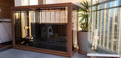 Caixas projetadas em vidro ou alumínio para acomodar condensadora de ar condicionado.